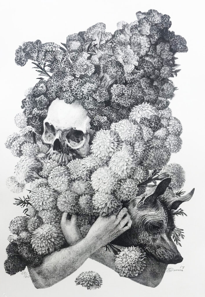 La construcción de esta carpeta de gráficas producidas desde técnicas diversas: litografías, xilografías, neolografía, litografía y grabado en metal, podría entenderse como un sarcasmo más contra la muerte.